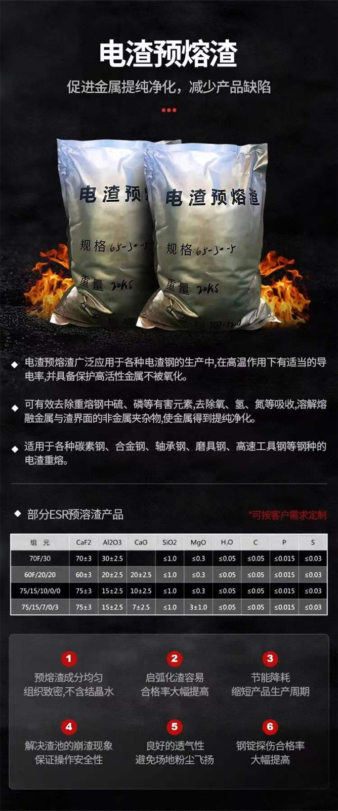 用于各类电渣钢(轴承钢、模具钢、合金钢等)的电渣重熔,通过高温导电性保护金属、去除 S/P/O/H/N 等有害元素与夹杂物,净化钢液、避免铸锭裂纹与夹杂超标。